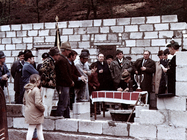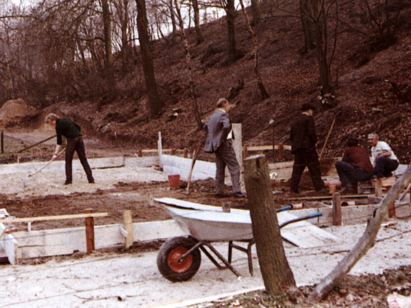 Von zwei interessanten Erlebnissen der Bauzeit gilt es noch zu berichten: Eine alte Buche am Hang, unmittelbar beim Schützenhaus, drohte unterspült zu werden und danach auf den Bau zu fallen. Keiner traute sich so recht an das komplizierte Problem, den die Schräglage war bedenklich und die Gefahr einfach zu groß. Dan kam die rettende Idee von guten Nachbarn - von der Bundeswehr. Ein Leutnant knüpfte den Kontakt zu den Emmericher Pionieren, die in einer geheimen Nacht-und-Nebel-Aktion den Baum fällten und fein säuberlich zersägt stapelten. Bevor jemand gemerkt hatte, waren die Pios schon wieder weg. Von hier aus nochmals vielen Dank für diese unbürokratische, eigentlich immer noch geheime Hilfe vom Bund.
